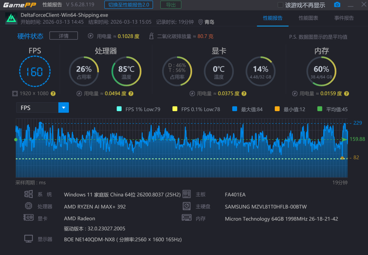 下面是另一款网游《三角洲行动》、在 1080P 分辨率 + 低画质预设 +FSR 性能档 + FSR 帧生成设置下,进行一局全面战场模式对战,游戏平均帧数来到了 160 帧,1% Low 达到了 79 帧,也是足够流畅游玩的水平。