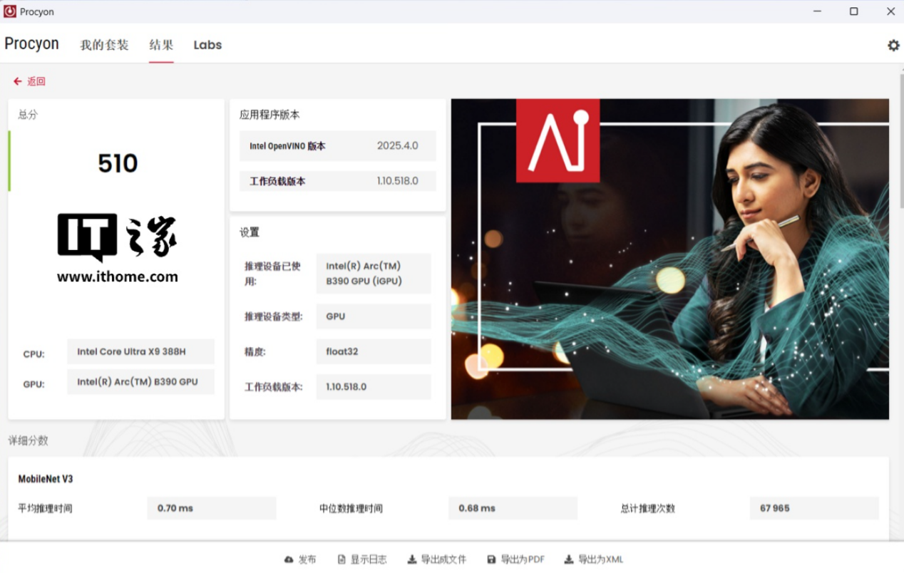 这里也用酷睿 Ultra X9 处理器 388H 跑一下 NPU 的测试,得到成绩为 1261 分,供大家做个参考。
