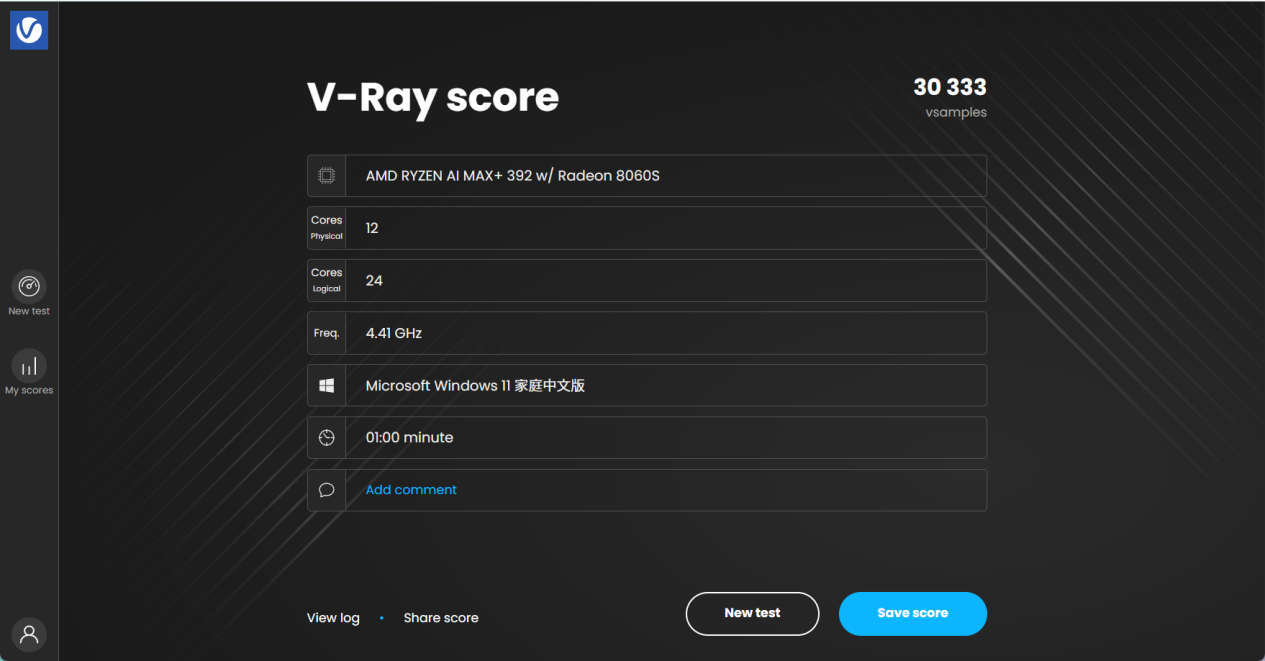 生产力表现上,在 V-Ray BenchMark 6 基准测试中,锐龙 AI MAX+ 392 处理器的跑分成绩为 30333 分。