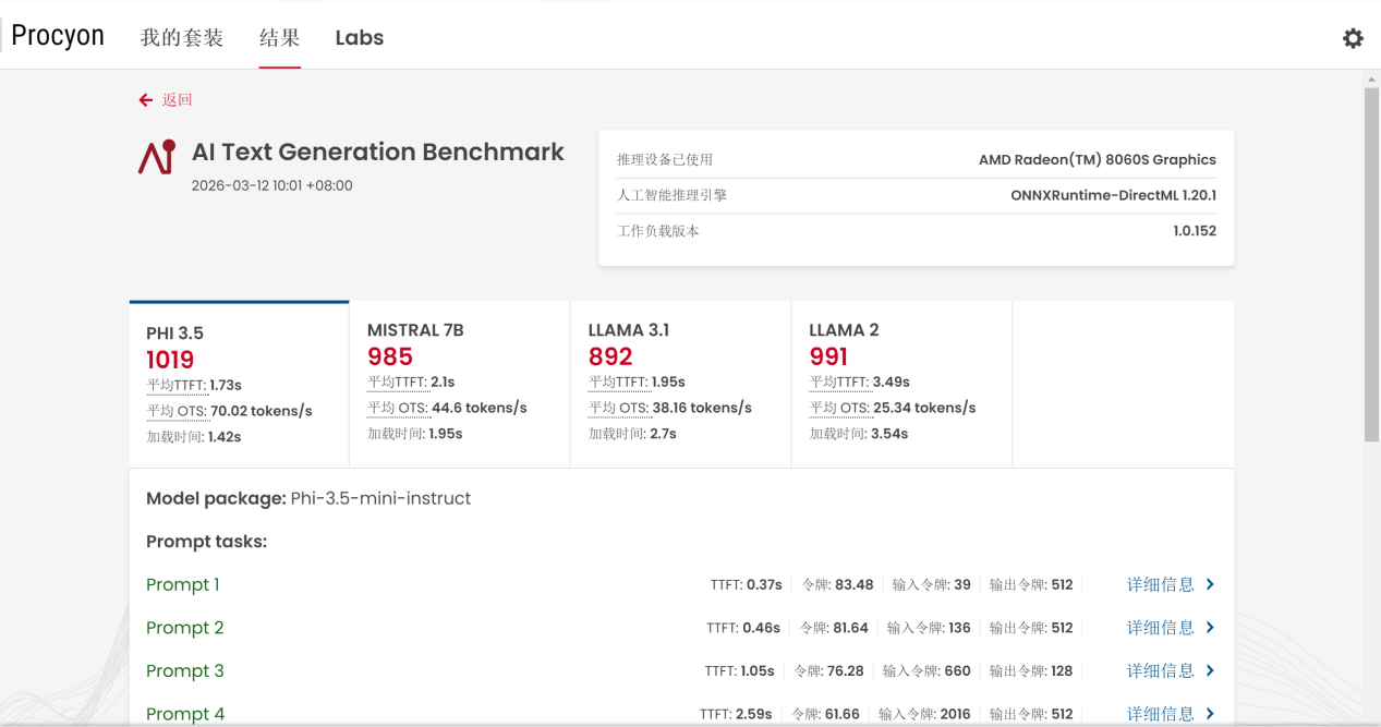 UL Procyon 的 AI 文本生成基准测试中,华硕天选 Air 2026 使用 Radeon 8060S 集显进行测试,得到 PHI3.5 模型 1019 分;MISTRAL 7B 模型 985 分;LLAMA 3.1 模型 892 分;LLAMA 2 模型 991 分。