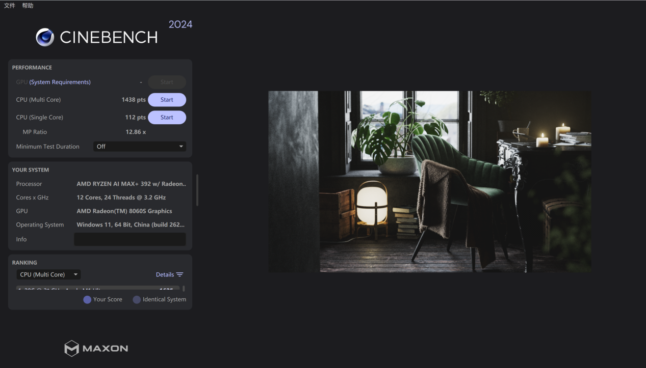 下面首先开始 CPU 的理论性能测试,在 CineBench 2024 的基准测试中,锐龙 AI Max+392 处理器单线程为 112 分,多线程为 1438 分。