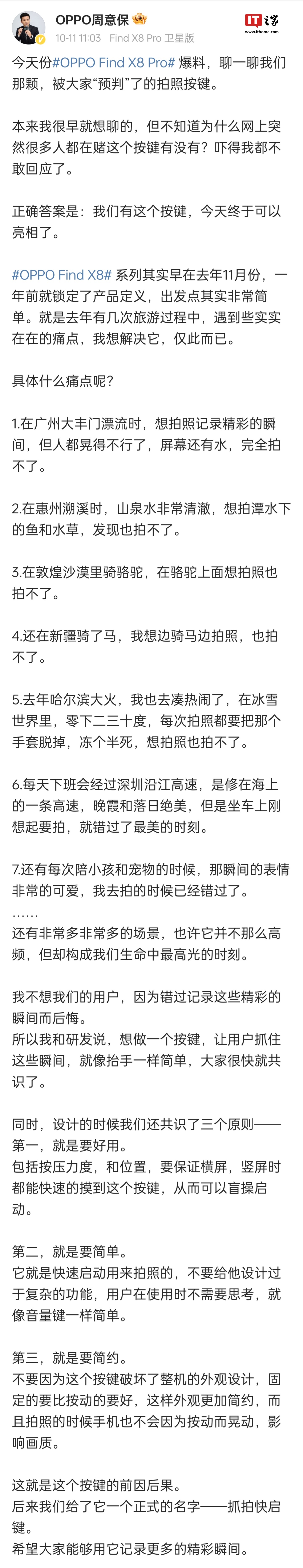 IT之家 10 月 11 日消息,OPPO Find 系列产品负责人周意保今日透露,Find X8 Pro 配备拍照按键,并命名为“抓拍快启键”。