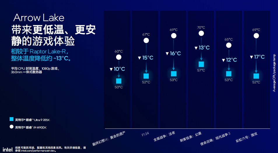 「冷静」的背后,意味着用户需要在散热系统上投入的成本会明显下降,如果说以前是非顶级360水冷不可,那么现在只需要一个标准的360水冷散热器就可以压制强大的Ultra 9 285K,并且获得不弱于i9-14900K的游戏性能。