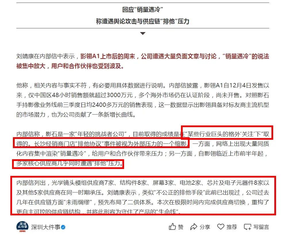 他透露,影翎无人机上市前半年,公司遭受7家光学镜头模组、8家结构件、3家屏幕、2家电池等核心供应商的“排他”施压。换句话说,这几家核心供应商必须站队,不与竞争对手合作,拒绝影石。