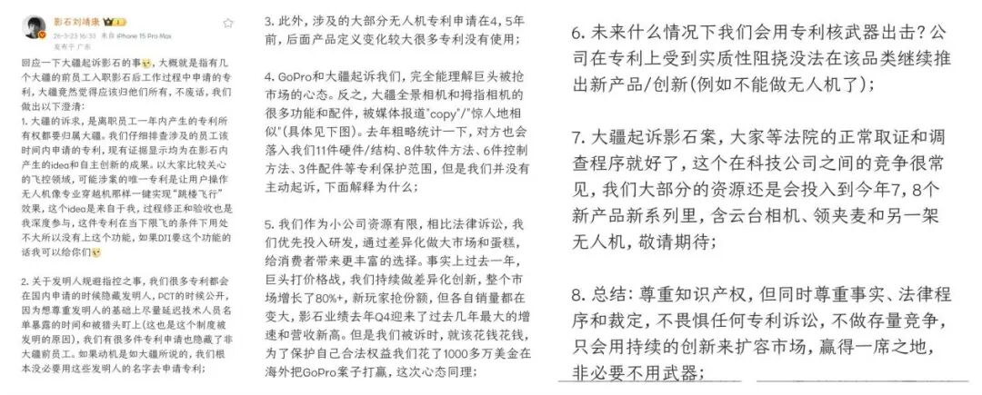 刘靖康还表达了非必要不用武器的态度,他指的武器,结合长文应该就是“公司在专利上受到实质性阻挠没法在该品类继续推出新产品/创新(例如不能做无人机了)”