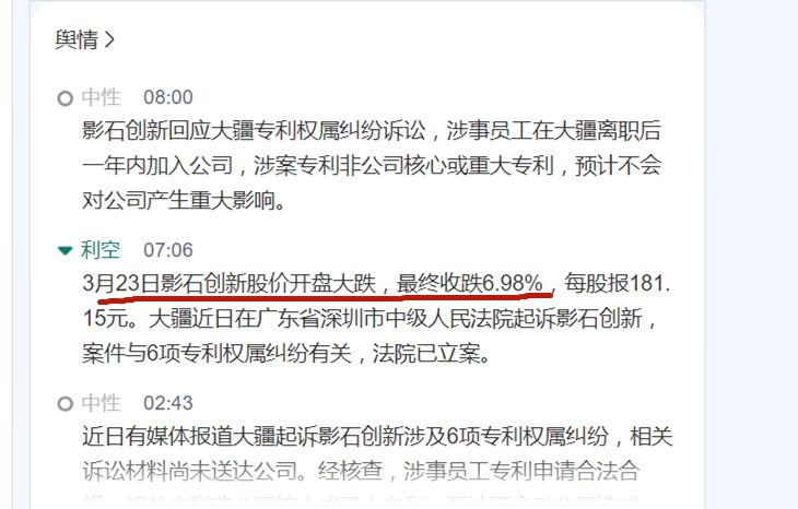 值得一提的是,大疆的起诉对影石客观上造成了一定的负面影响,从舆情监控结果来看,该起事件也是影石近期遭遇的最大利空之一,比如23日开盘大跌,收跌6.98%,影石CEO刘靖康甚至在微博安慰散户股东“很抱歉市值没管理好导致您亏损了…”