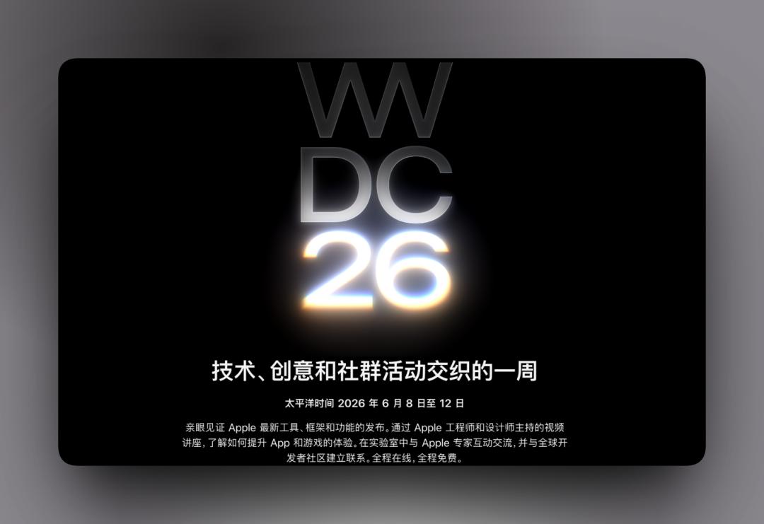 凌晨苹果正式官宣:全球开发者大会WWDC 2026将于北京时间6月9日开幕,也就是说iOS 27、iPadOS 27、macOS 27……全都要来了。