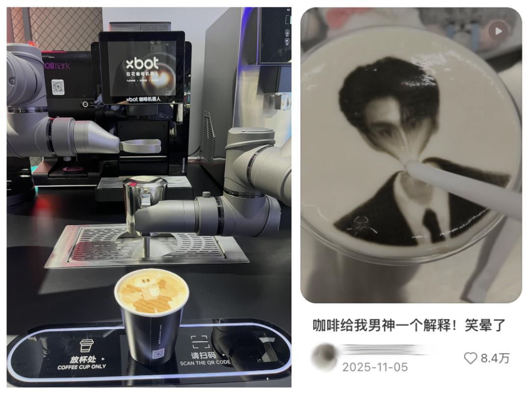 如果担心光吃煎饼容易晕碳,你还可以让xbot拉花咖啡机器人为你做一杯16.9元的拿铁,如果想要扫码定制专属印花,还得再额外加9元。