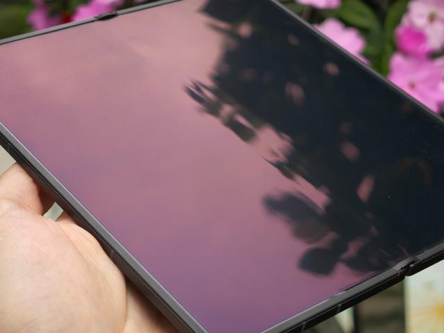 实际使用一段时候后,亮屏下仍然看不到折痕的存在,但在息屏的特定角度下,光线会把这点微小的起伏重新「勾勒」出来,用肉眼就能看到它。