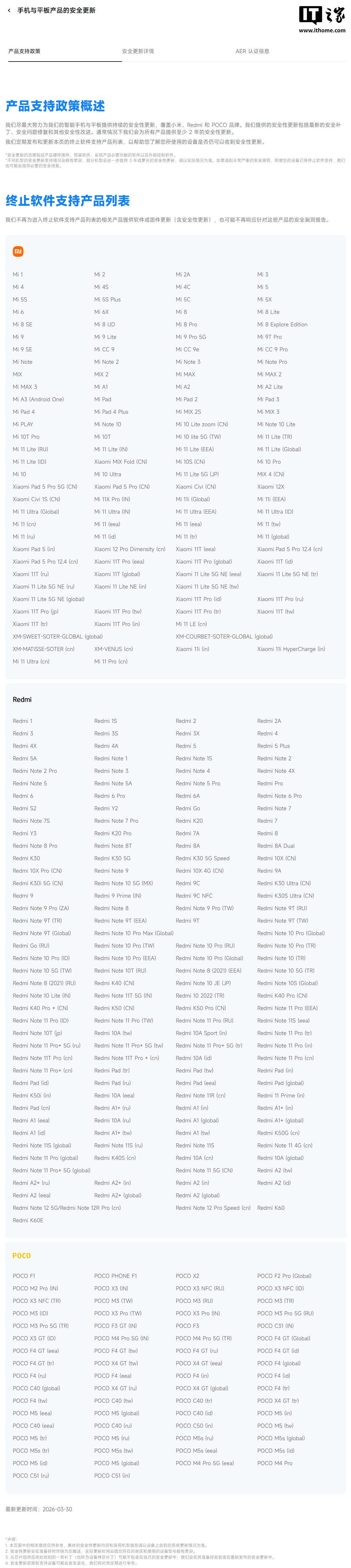 IT之家 3 月 30 日消息,小米官网安全中心现更新智能硬件产品终止软件支持产品列表。IT之家注意到,智能手机与平板板块显示,Redmi K60 和 Redmi K60E 将停止软件或固件更新(含安全性更新),也可能不再响应针对这些产品的安全漏洞报告。