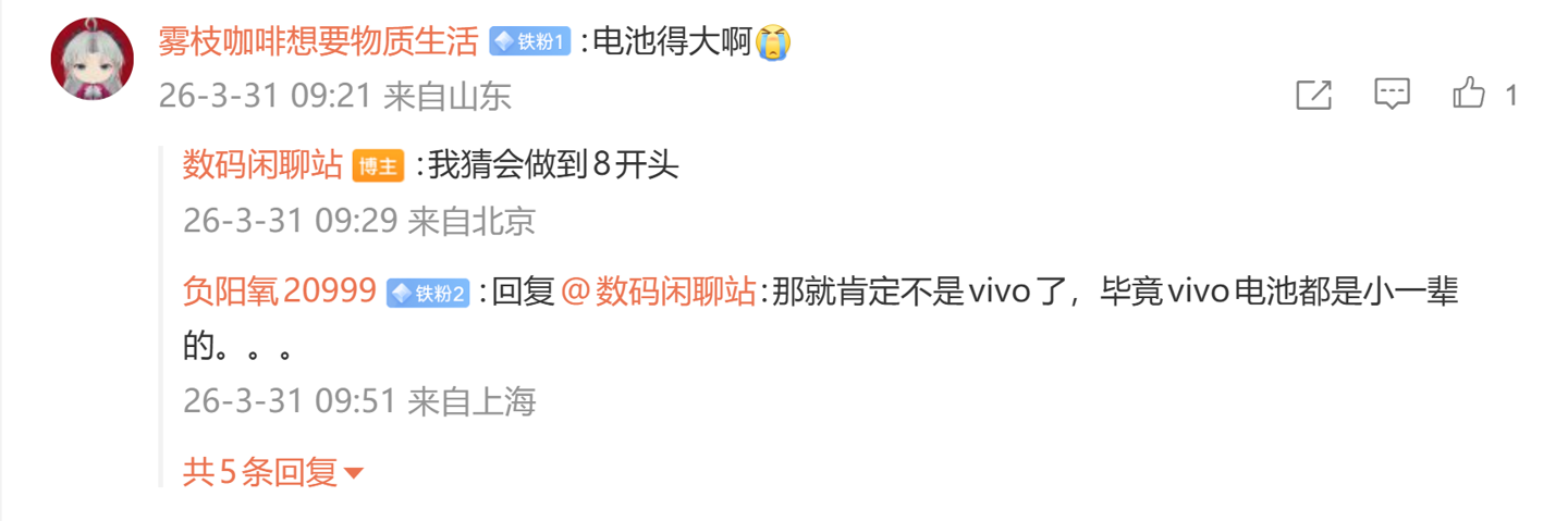 后续有用户在评论区表示:“建议超广退一档 1/2,长焦换成 1/1.12”,博主回复道:“超大杯不卖了??”;另一名用户则表示:“电池得大啊”,博主则回复道:“我猜会做到 8 开头”。