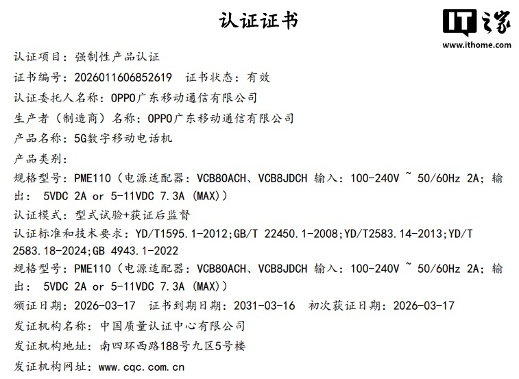 据IT之家此前报道,一款型号为 PME110 的 OPPO 神秘新机已经通过国家 3C 认证,@数码闲聊站 等爆料人士认为这是 OPPO Find X9s Pro 手机,标配 80W 充电器。