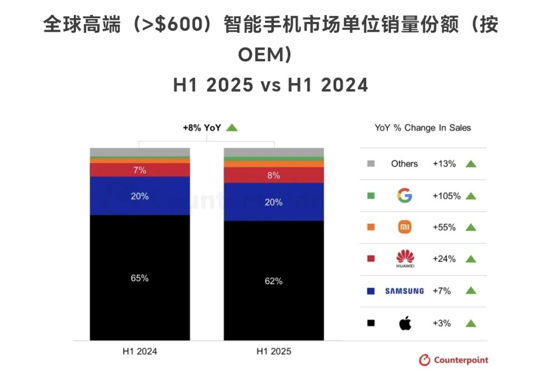 Counterpoint报告显示,2025年上半年,在全球600美元以上市场榜单上,vivo榜上无名,属于other范畴。