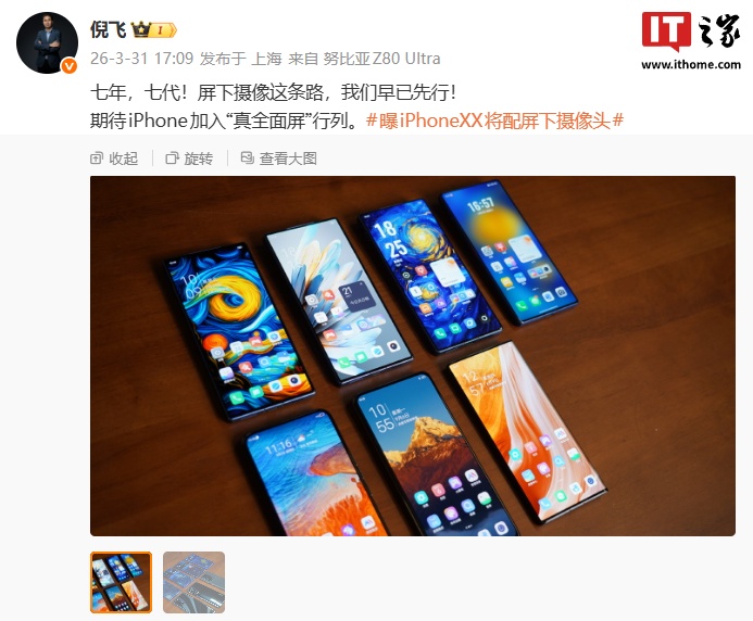 中兴通讯终端事业部总裁、努比亚技术有限公司总裁倪飞今日发文谈及了“曝 iPhoneXX 将配屏下摄像头”这一话题。