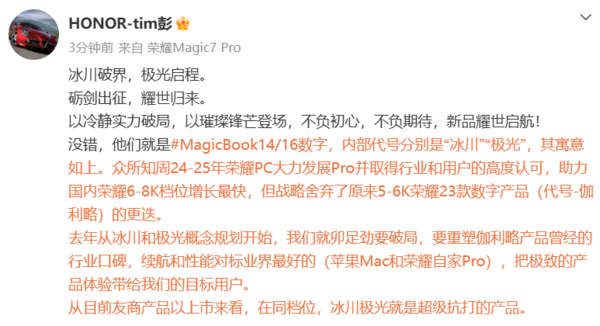 【CNMO科技消息】4月1日,荣耀工作人员“HONOR-tim彭”发文称,荣耀MagicBook 14/16数字系列笔记本,内部代号分别为“冰川”和“极光”。2024-2025年,荣耀PC大力发展Pro系列产品并取得行业和用户的高度认可,助力荣耀在国内6000-8000元价位段实现快速增长。但该战略舍弃了原来5000-6000元价位段荣耀23款数字产品(代号-伽利略)的更迭。