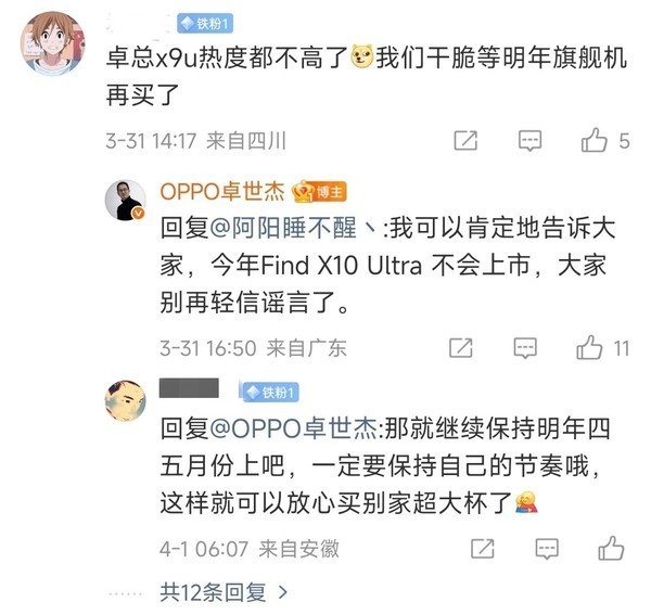 【CNMO科技消息】4月1日,CNMO注意到,OPPO Find系列产品负责人卓世杰近日就OPPO Find X10 Ultra的上市传闻作出回应,明确表示该机型今年不会上市,提醒消费者切勿轻信相关谣言。对于这一回应,有网友表示:“那就继续保持明年四五月份上吧,一定要保持自己的节奏哦,这样就可以放心买别家超大杯了”。