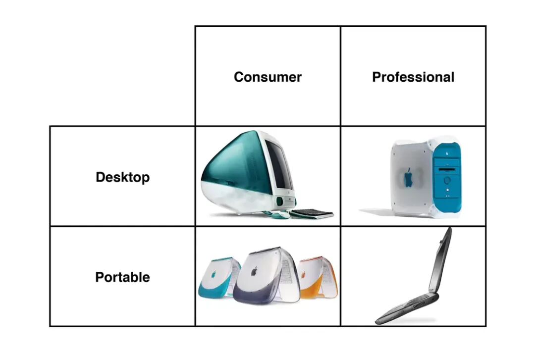 在调整中,最具象征意义的改变是一张极其简单的表格。乔布斯将苹果原本混乱不堪的产品线压缩成一个由两个维度构成的结构:「消费级」与「专业级」,「桌面设备」与「便携设备」。所有产品被要求毫无偏差地落入这四象限之中。这看似一种简化,但其本质更接近于一次彻底的清理。那些无法被明确定位的产品被迅速淘汰,模糊与冗余被视为不可接受的状态。公司不再试图覆盖一切可能,而是被迫做出选择——明确自己服务的对象以及亟需解决的问题。