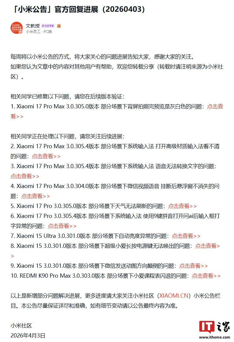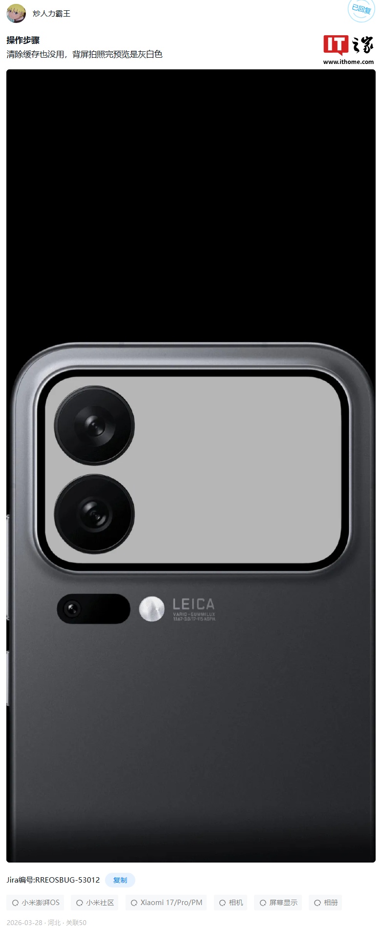 IT之家 4 月 5 日消息,小米员工本周在小米社区发布了澎湃 HyperOS 3 最新优化进展,其中提到用户所反馈的 Xiaomi 17 Pro Max 在 3.0.305.0 版本部分场景下背屏拍照完预览是灰白色的问题已优化。