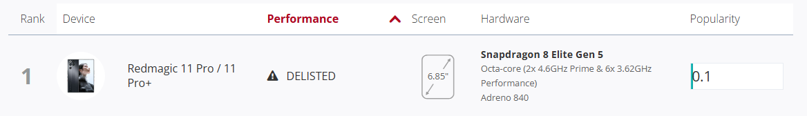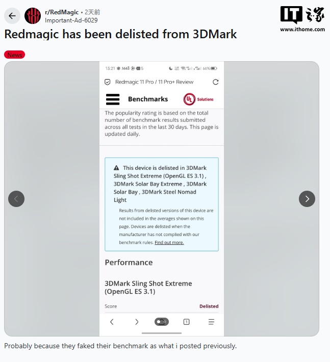 IT之家 4 月 7 日消息,有用户发现,基准测试平台 3DMark 已将红魔 11 Pro 及 Pro+ 旗舰机型从其官方榜单中除名,理由是认定它在跑分测试中存在“作弊”类行为。