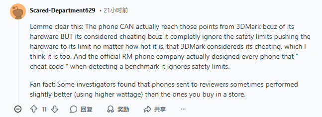 这位网友还提到,有部分厂商的部分送测机型有时会表现出略高于零售机的性能(例如使用更高功率进行跑分)。