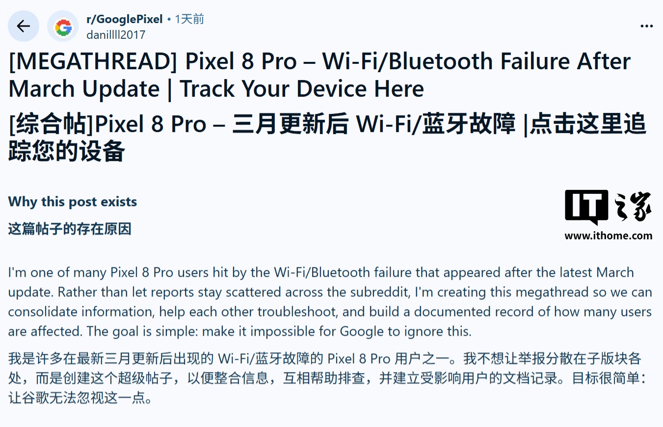 IT之家 4 月 7 日消息,科技媒体 Android Authority 昨日(4 月 6 日)发布博文,报道称用户反馈谷歌 3 月更新存在诸多 BUG,包括锁屏卡死、Wi-Fi 和蓝牙连接故障以及无限重启等等。
