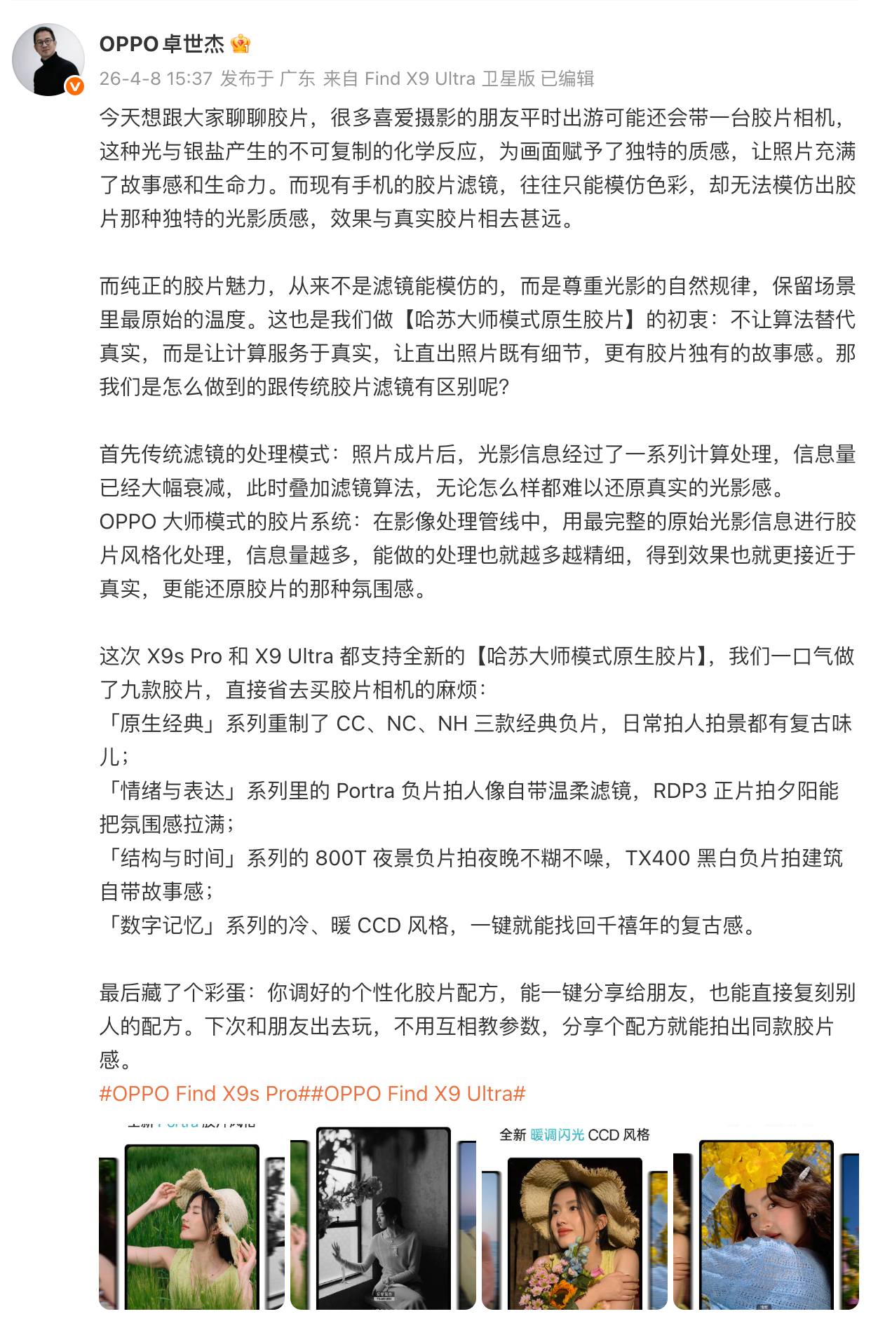 IT之家 4 月 8 日消息,随着发布会的临近,官方对 Find X9 系列的影像预热进一步深入。今日,OPPO Find 系列产品负责人卓世杰在微博连续发布两篇图文,正式揭晓了“哈苏大师模式”的全新重磅升级。此次升级不仅带来了专属的“胶片配方水印”,更带来了“哈苏大师模式原生胶片”,进一步将 Find X9s Pro 与 Find X9 Ultra 的哈苏专业感拉满。