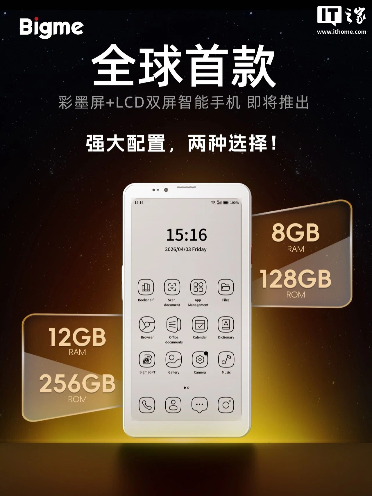 IT之家注意到,Bigme 大我今日率先公布了全球首款彩色墨水屏 + LCD 双屏手机的内存配置: