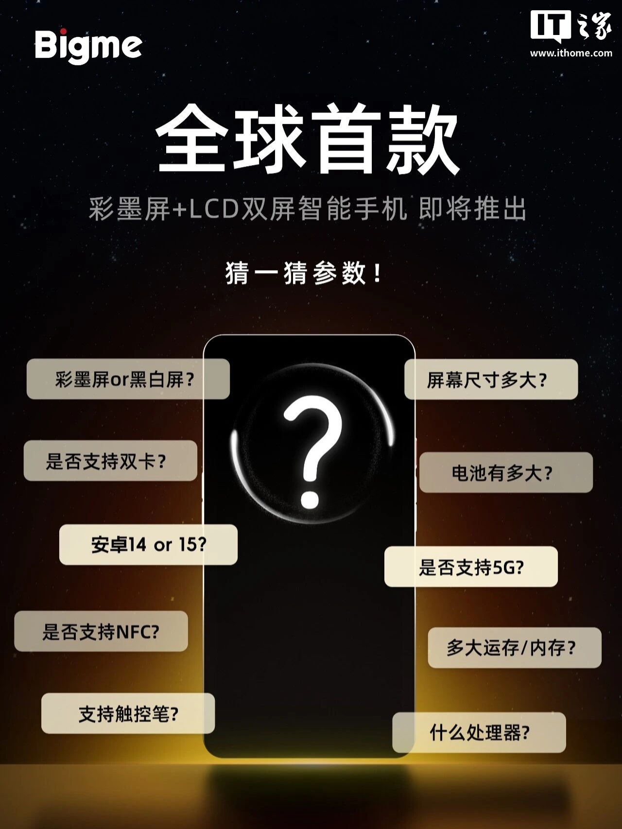 值得一提的是,Bigme 大我此前还发布了一张预热海报,让大家“猜一猜”参数。目前这款新机确认拥有彩墨和黑白两个版本。以此类推,根据官方给出的问题选项来看,系列新机预计会预装安卓 14 & 15 系统,支持 NFC、触控笔、5G 等功能。