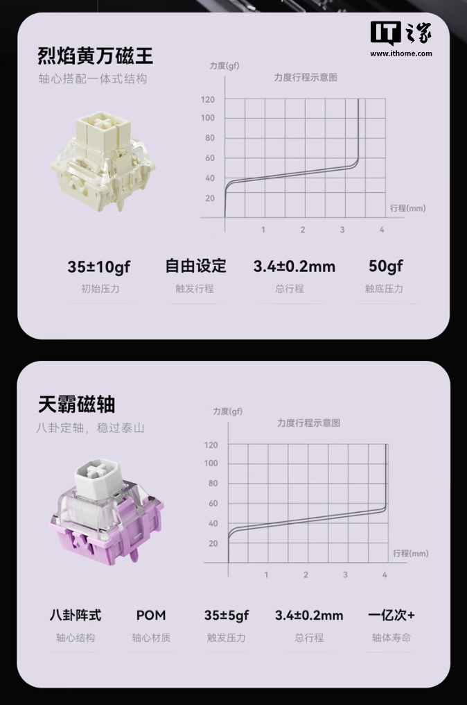 官方强调,系列键盘采用“VGN 全自研金字塔方案”,即“内置 512MHz 主核 + 240MHz*2 协核三芯片”,提供 8KHz 回报率及全段 0.001mm RT 精度,键盘可选烈焰黄万磁王轴和天霸轴两种轴体。