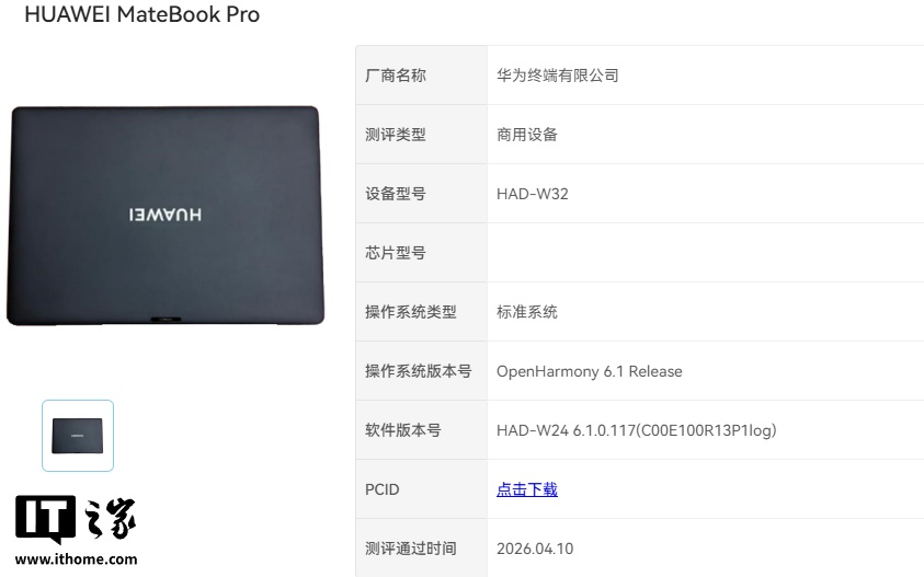 IT之家 4 月 11 日消息,华为 MateBook 14 2026(MNTXM-32A)及 MateBook Pro(HAD-W32)已于昨日通过开源鸿蒙 OpenHarmony 评测认证,均预装了最新的 6.1.0.117 版本系统。