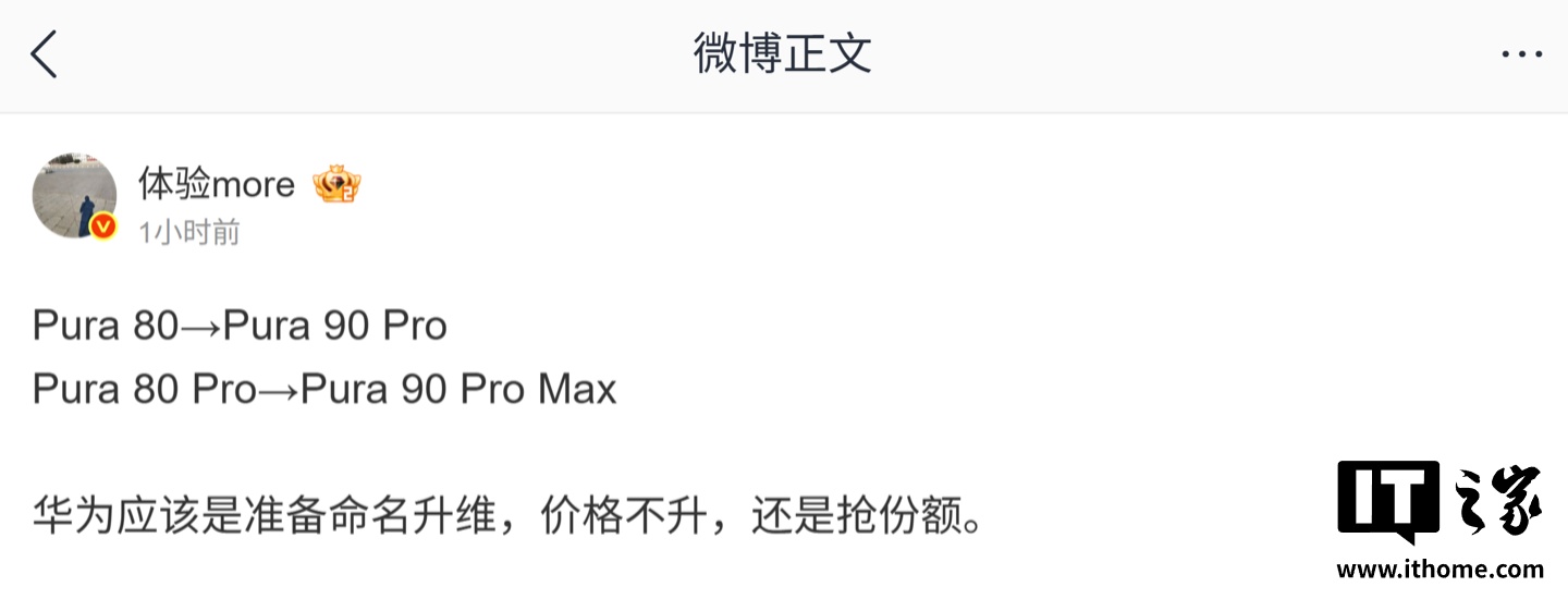 IT之家 4 月 11 日消息,博主 @体验 more 今天在微博透露,华为应该是准备命名升维,价格不升、还是抢份额。