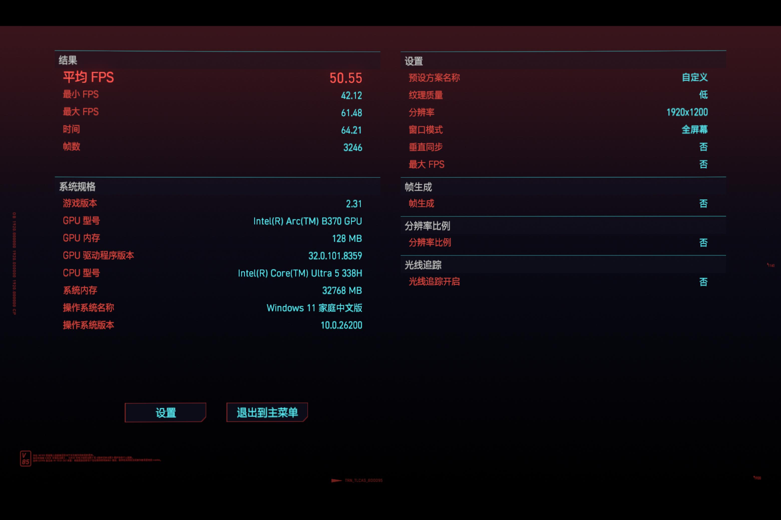 但是,英特尔第三代酷睿Ultra已经依靠先进制程工艺,大幅提升了性能和功耗。以我购买的这台338H芯片版的笔记本来说,尽管它是一台超薄笔记本,但已经能流畅运行部分3A大作。以赛博朋克2077来说,低画质1200P分辨率下,平均帧数能达到50帧左右。过去,这个性能表现是无法想象的。