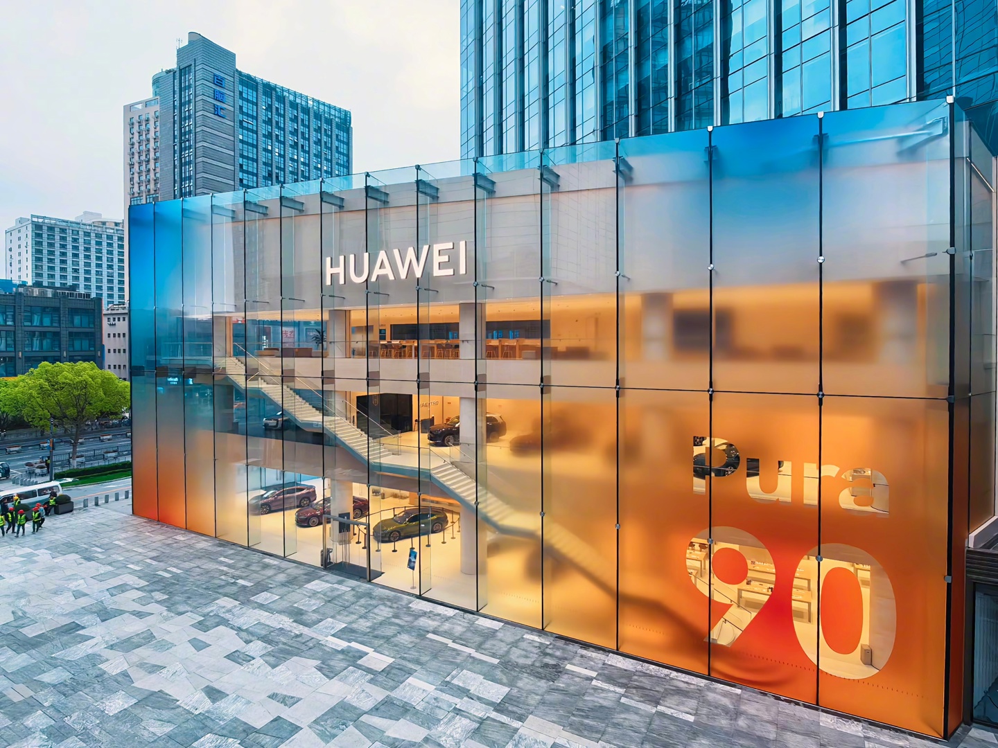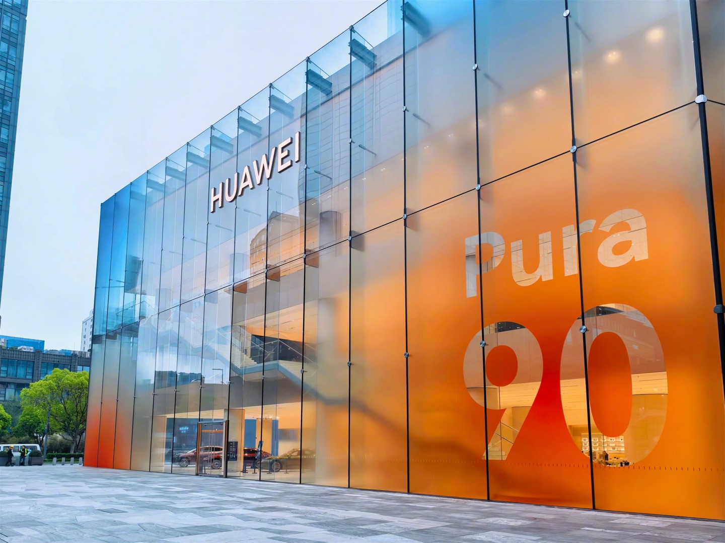 可以看到,为了迎接华为 Pura 90 系列手机的发布,该店玻璃幕墙采用了与华为 Pura 90 Pro Max 橘子海相同的配色,玻璃上还有 Pura 90 字样。