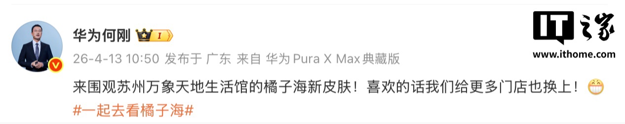 IT之家注意到,华为终端 BG 首席执行官何刚今日(4 月 13 日)展示了华为苏州万象天地生活馆的橘子海新皮肤,并表示“喜欢的话我们给更多门店也换上”。