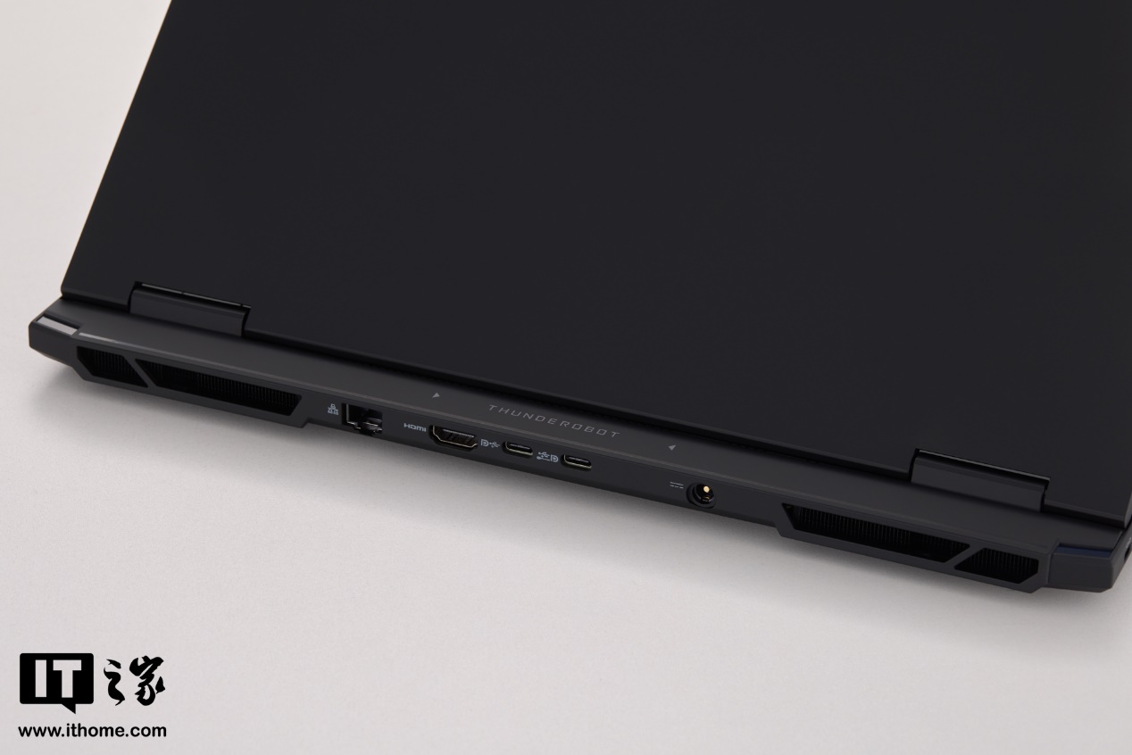 接口布局上,雷神 ZERO Air 15 采用三向排布,机身背部提供 RJ45 网口、HDMI 接口、双 USB-C 接口以及独立 DC 电源接口。