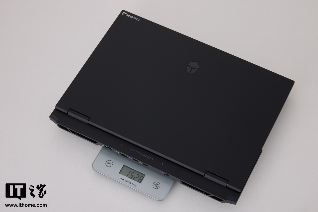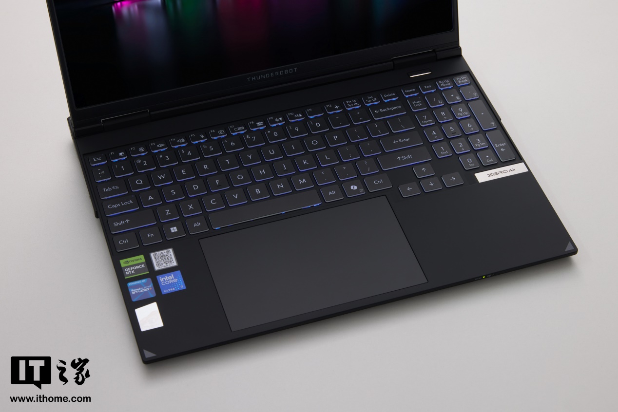 雷神 ZERO Air 15 首发提供幻夜黑、月影白双色可选,IT之家拿到的是幻夜黑配色,航空级镁合金机身加上准分子 UV 漆表面工艺,黑得深邃纯粹,手感亲肤温和。