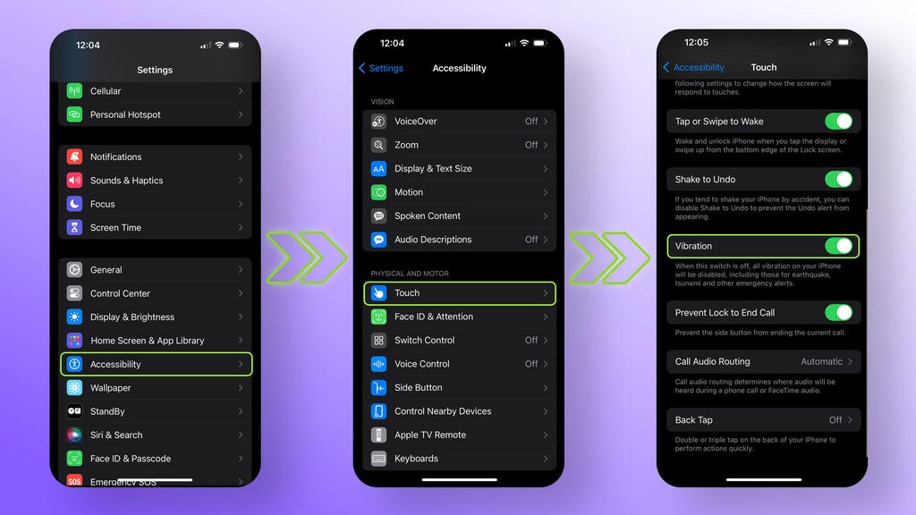 虽然响铃/静音开关会关闭所有提醒和通知(包括音效和游戏音频),但你的iPhone在接到电话时可能仍会振动。而且,当有电话或短信到来时,屏幕会亮起。你可以通过进入设置>辅助功能>触控,然后点击振动旁边的开关将其关闭,从而阻止iPhone在静音模式下振动。(但请注意,这样做也会禁用地震、海啸等紧急警报的振动。)然而,你无法阻止屏幕亮起,这就引出了我们接下来要讨论的内容。