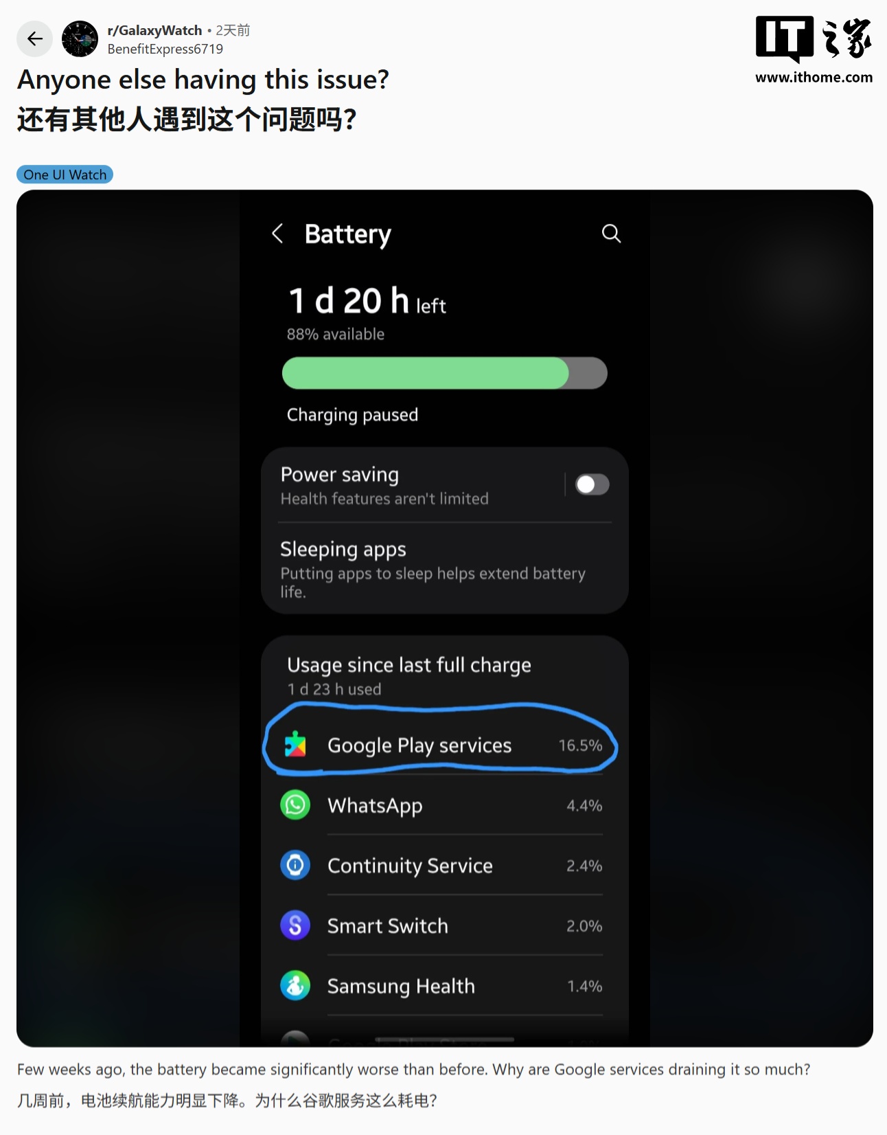 IT之家 4 月 14 日消息,科技媒体 Android Police 昨日(4 月 13 日)发布博文,报道称多名 Galaxy Watch 智能手表用户在 Reddit 社区反馈,安装更新后出现续航时间大幅缩水情况。