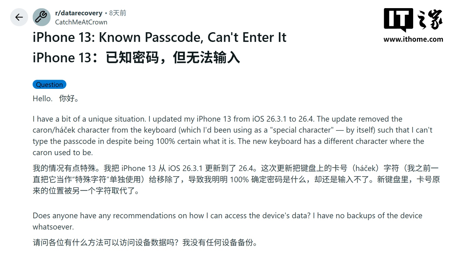 这名用户表示,他之前一直使用捷克语键盘,手机的密码包含特殊字符 háček(IT之家注:抑扬符,即“ˇ”)。但升级 iOS 26.4 后,这个字符从键盘中消失了,导致他再也无法解锁手机。