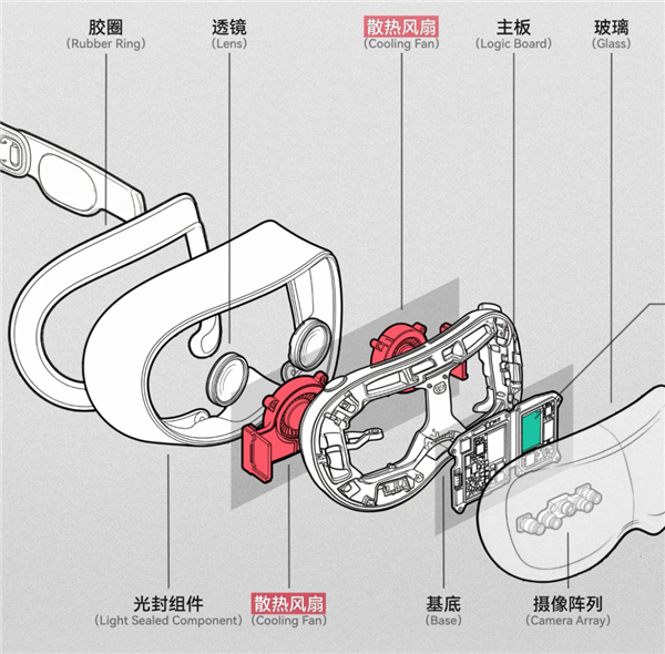 外侧有摄像头拍摄现实,里边是单目 2K 分辨率的全彩 MicroOLED 显示屏,通过算法实现虚实融合—— 这就跟苹果 Vision Pro 的逻辑一模一样。