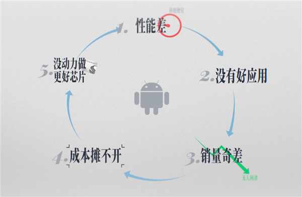 安卓这边价格相对便宜但是性能不行,性能不行就开发不出引人入胜的好游戏好应用、所以生态更不行,生态更不行了销量就暴死。