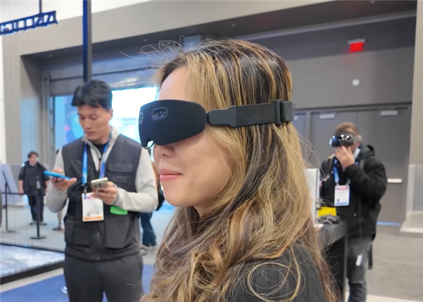 比方说今年1月份的 CES 大会上,玩出梦想就展出了类似的眼镜方案,它这个虽然看起来更像是一个睡眠眼罩,但产品的结构跟我们看到的工程样机是差不多的,都是眼镜本体放图像处理器,再连一个外挂的电池和主算力盒子。