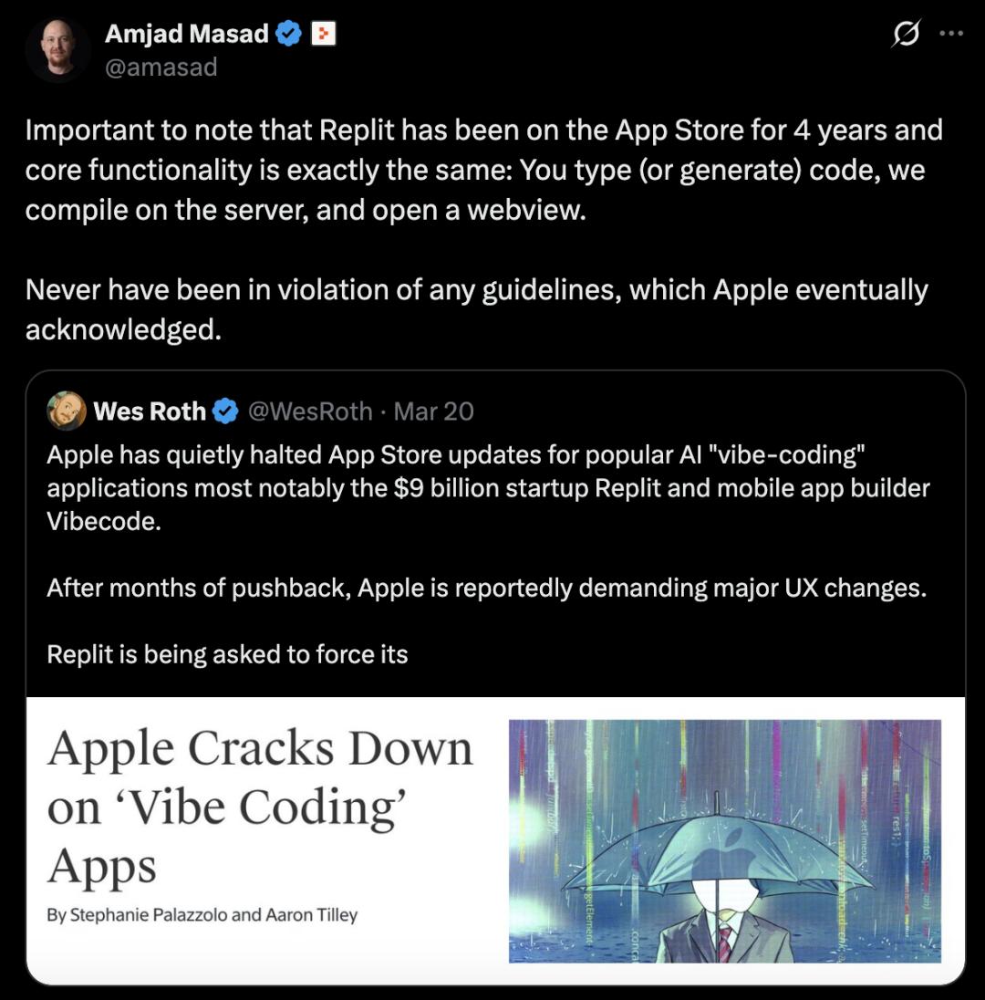 前天,还在愤怒中缓不过来的 Amjad Masad 再次发 x 痛斥苹果站在了历史错误的一边。