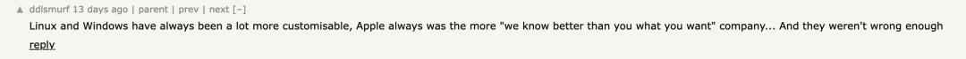 一部分评论将这一事件放在更宏观的生态竞争中来看。有用户指出,长期以来,Linux 和 Windows 在可定制性上明显优于苹果,而苹果则坚持“由平台定义用户体验”的理念。在生成式 AI 让“软件定制化”成为可能的当下,这种模式可能面临挑战。