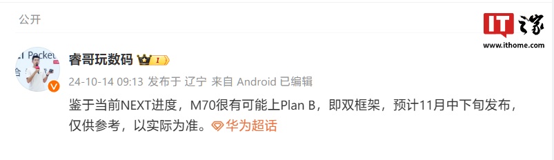 IT之家 10 月 14 日消息,今天上午,博主 @睿哥玩数码 发文透露:“鉴于当前 NEXT 进度,Mate 70 系列很有可能上‘Plan B’即双框架,预计 11 月中下旬发布,仅供参考,以实际为准。”