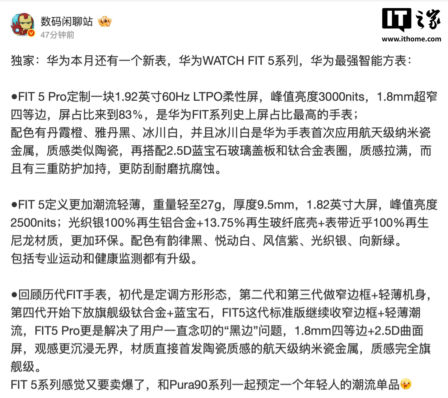 据博主 @数码闲聊站 今早爆料,FIT 5 Pro 定制一块 1.92 英寸 60Hz LTPO 柔性屏,峰值亮度 3000nits,1.8mm 超窄四等边,屏占比来到 83%,是华为 FIT 系列史上屏占比最高的手表。