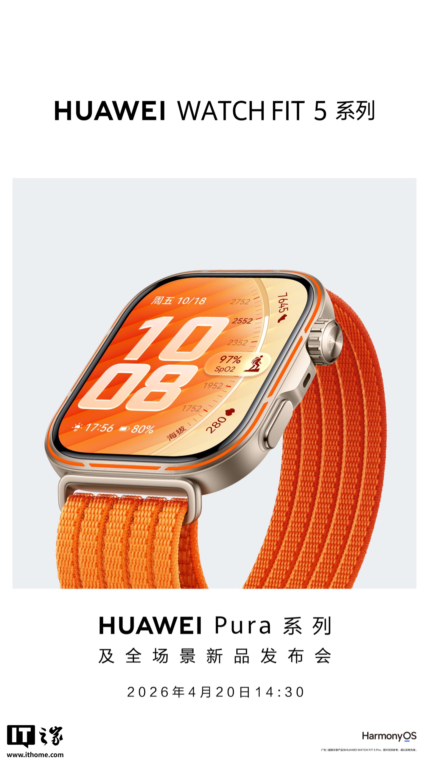 IT之家 4 月 16 日消息,华为官方今日宣布,WATCH FIT 5 系列智能手表将于 4 月 20 日 14:30 在华为 Pura 系列及全场景新品发布会发布。