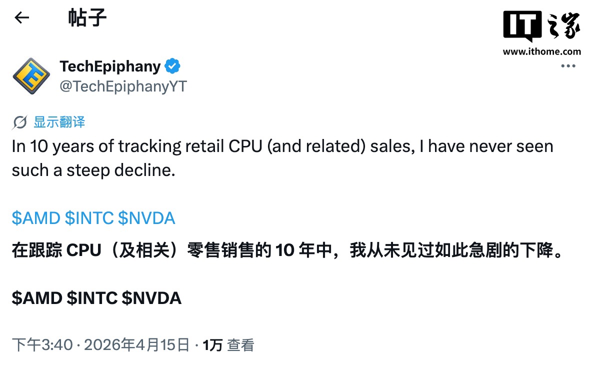 IT之家 4 月 16 日消息,博主 @TechEpiphanyYT 昨日在 X 平台表示,在其追踪零售 CPU(及相关产品)销量的 10 年里,从未见过如此剧烈的下滑。
