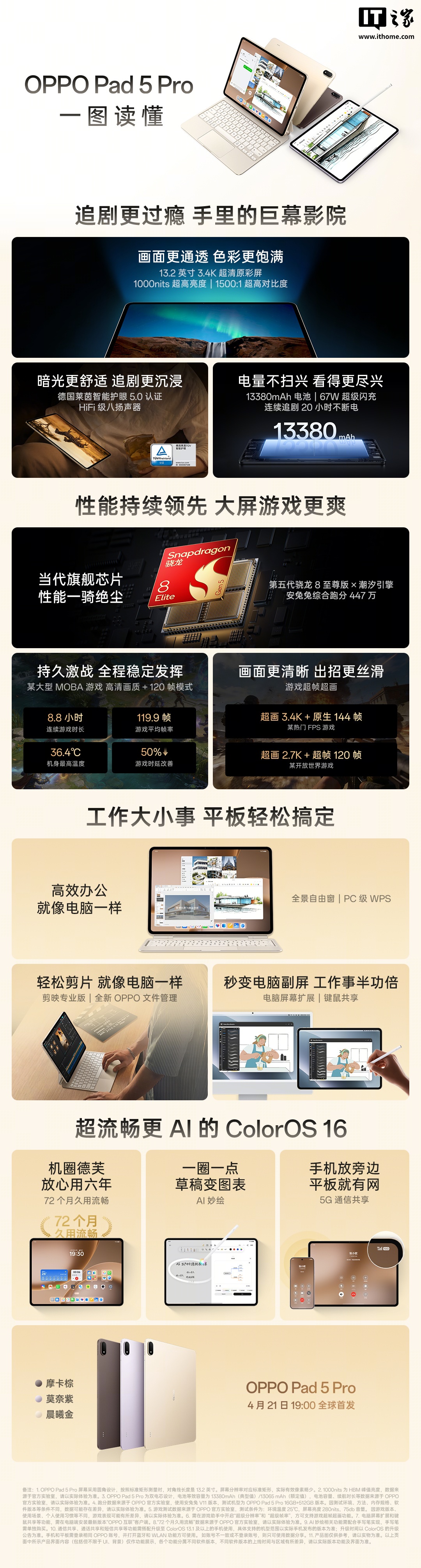 IT之家 4 月 16 日消息,前两日,OPPO 首曝了 Pad 5 Pro 平板部分旗舰配置。今日,OPPO 再次出手,公布了新款旗舰平板更多亮点信息,宣称“OPPO Pad 5 Pro 一图读懂”。
