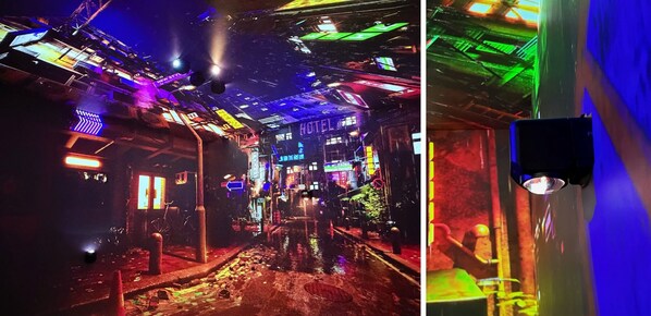 在这里,参观者可清晰感受霓虹灯光在湿润地面上倒映的色彩,以及领略浩瀚星空与金属舰体的细腻质感。所有投影机均巧妙隐藏于体验空间的天花板和墙体内,既确保了画面的整体感与艺术美感,也降低了视觉干扰,让人全然沉浸于流动的光影世界之中。